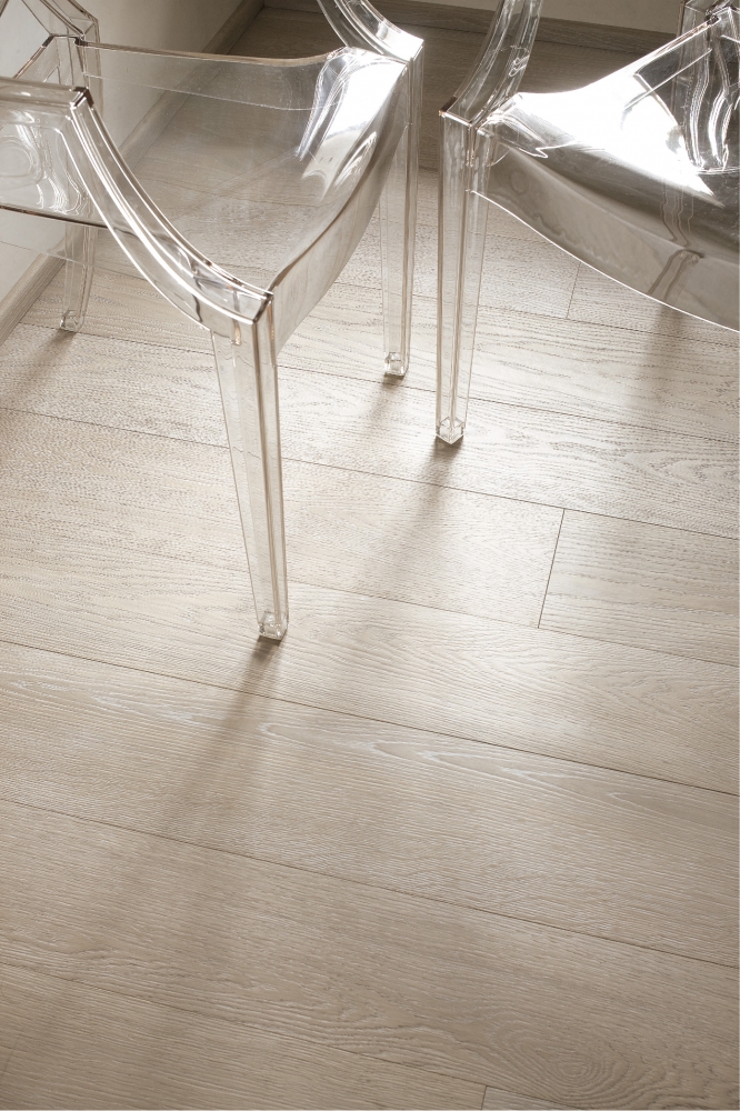 Предлагается из паркетных досок с выбеленной лакировкой, создающей осязательные ощущения и эстетику пропитки маслом.